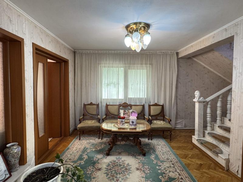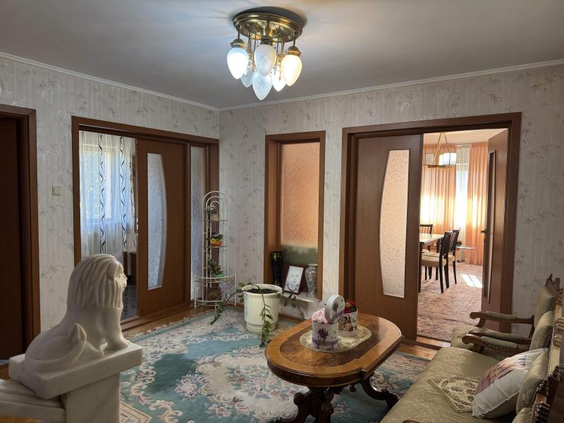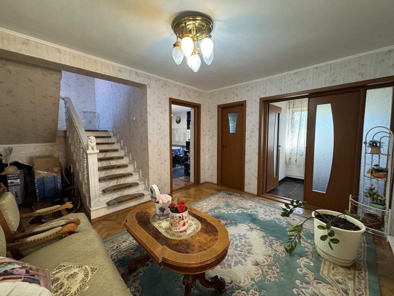 LA PARTER: living, 2 bucatarii, debara, camera centrala, 3 holuri, WC, casa scarii, magazie si beci.